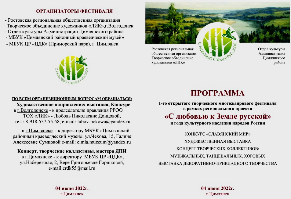 Организаторы фестиваля: ростовская региональная общественная организация Творческое объединение художников «ЛИК» г. Волгодонск, отдел культуры администрации Цимлянского района, МБУК «Цимлянский краеведческий музей», МБУК ЦР «ЦДК» (приморский парк) г. Цимлянск.