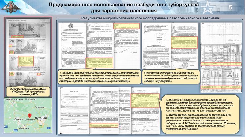 Начальник войск радиационной, химической и биологической защиты России генерал-лейтенант Игорь Кириллов заявил, что высокую вероятность подобных провокаций подтверждают запросы киевской администрации на поставку средств индивидуальной защиты кожи и органов дыхания, обеспечивающих защиту от токсичных химикатов и биологических поражающих агентов. По словам генерала, вызывают беспокойство факты поставки на Украину антидотов фосфорорганических отравляющих веществ. «Только в 2022 году по запросу минздрава Украины из США было доставлено более 220 тысяч ампул с атропином, а также препаратов для специальной обработки и дезинфекции», — сообщил Кириллов.