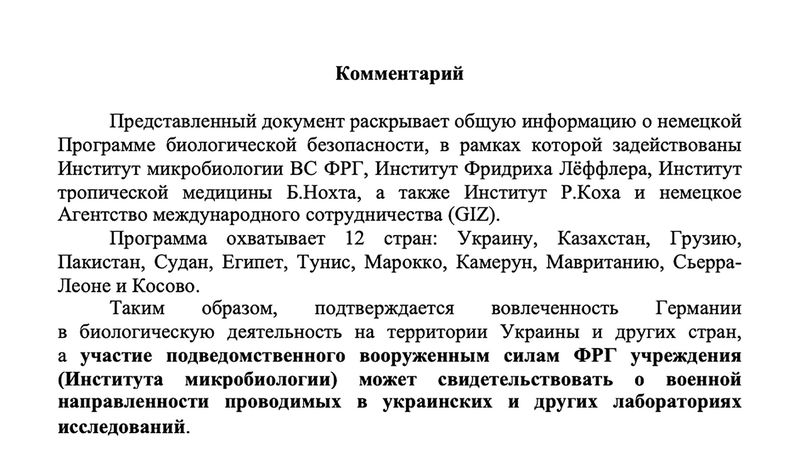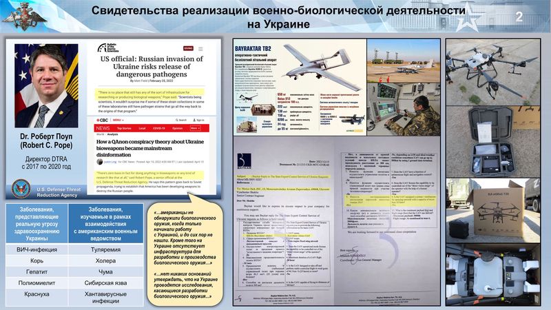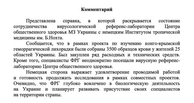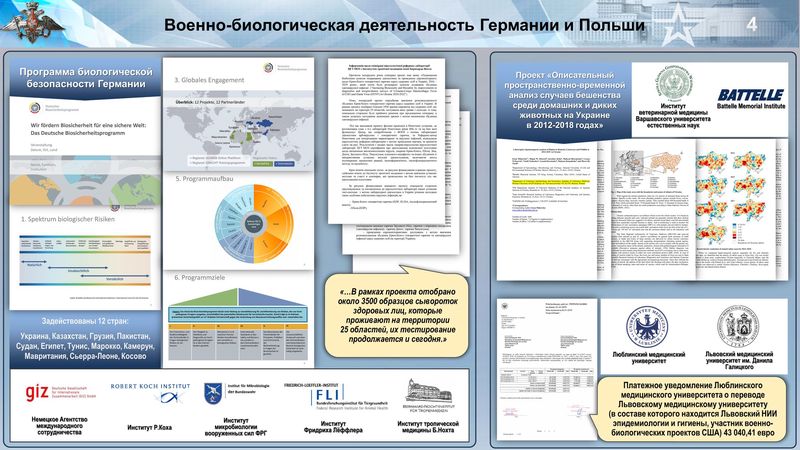 По ее данным, в военно-биологическую активность были вовлечены 30 лабораторий, расположенных в 14 населенных пунктах. Велась она на основе соглашения между военным ведомством США и минздравом Украины, а сама программа была подписана заместителем госсекретаря кабмина Украины Виктором Полищуком.