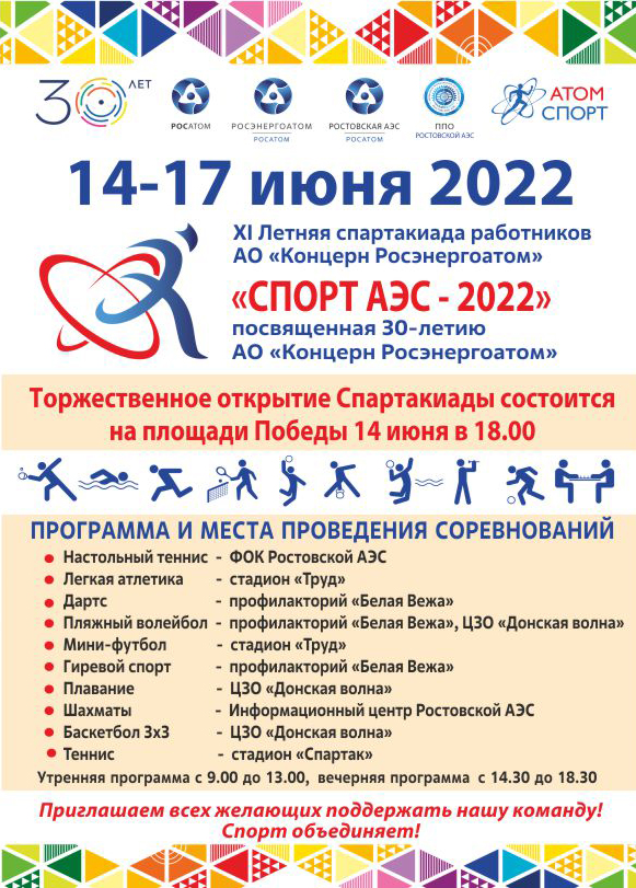 Открытие спартакиады состоится 14 июня в 18.00 на площади Победы. В программе – приветствие руководителей концерна, Ростовской АЭС и администрации Волгодонска, концертная программа, подготовленная творческими коллективами Волгодонска, технопарк от ВИТИ НИЯУ МИФИ, развлекательные площадки в парке Победы.