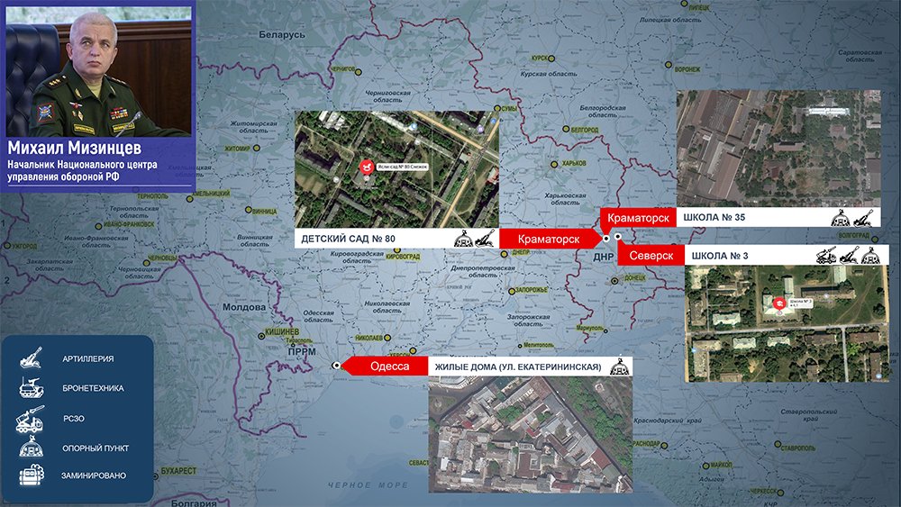 В российском межведомственном координационном штабе по гуманитарному реагированию продолжают фиксировать новые факты использования ВСУ и украинскими националистами объектов гражданской инфраструктуры в военных целях. Об очередных таких случаях рассказал начальник Национального центра управления обороной РФ генерал-полковник Михаил Мизинцев.