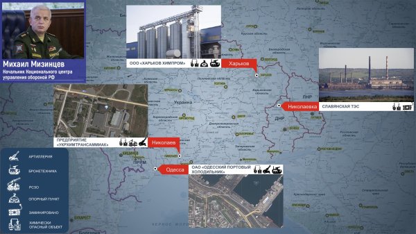 «Украинские вооруженные формирования, используя объекты химической промышленности для размещения подразделений и военной техники, умышленно создают предпосылки к возникновению техногенных аварий, в результате которых могут пострадать тысячи мирных граждан», — предупредил руководитель российского межведомственного координационного штаба по гуманитарному реагированию, начальник Национального центра управления обороной РФ генерал-полковник Михаил Мизинцев.