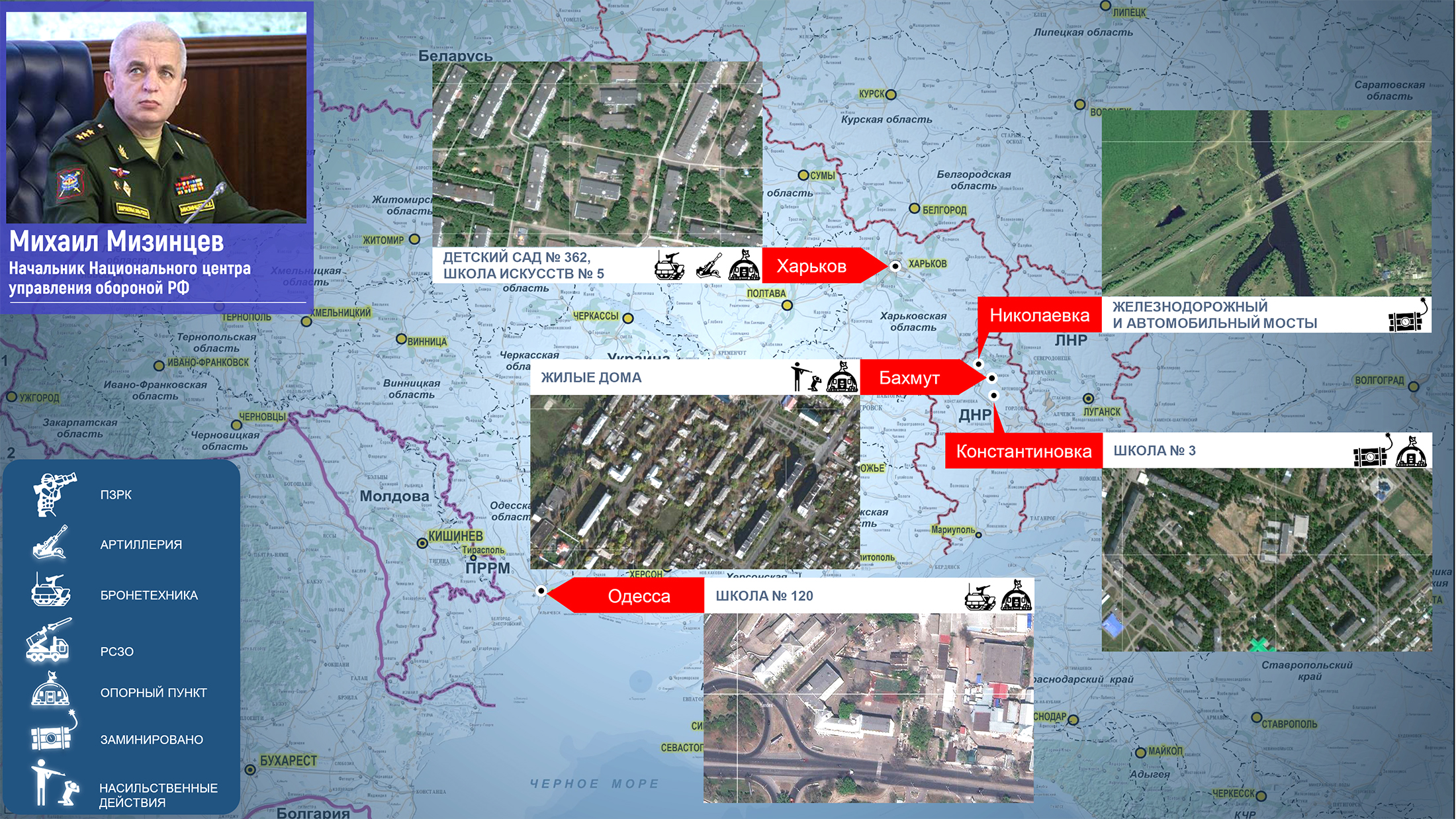 В российском межведомственном координационном штабе по гуманитарному реагированию продолжают фиксировать факты преступлений киевского режима в отношении мирных граждан, а также использования вооруженными формированиями Украины жилых домов, образовательных учреждений и других социальных объектов в военных целях. О новых таких случаях рассказал руководитель этого штаба начальник Национального центра управления обороной РФ генерал-полковник Михаил Мизинцев.