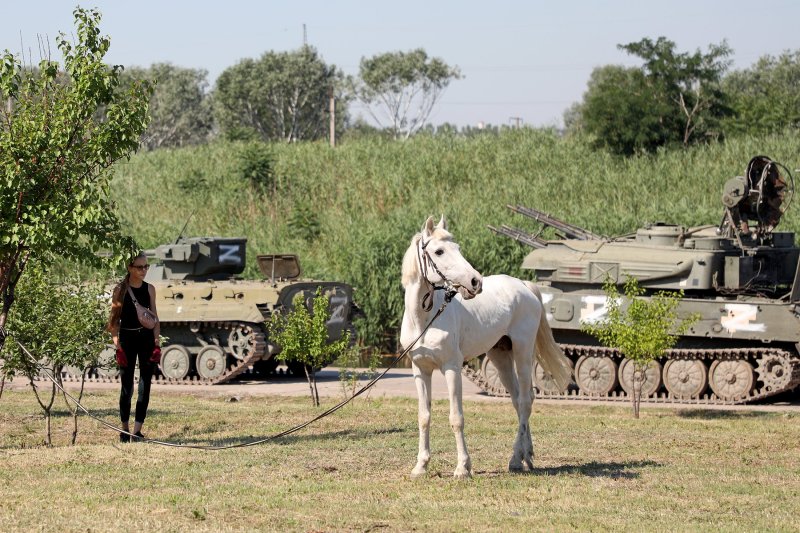 В день открытия военной трофейной техники волонтеры Мариупольского зоопарка вывели пару лошадей, которых прятали во время боев за город.