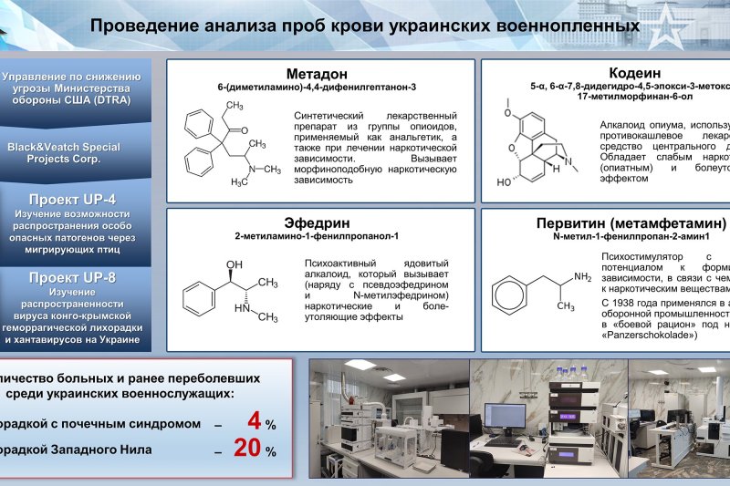По его словам, в частности, продолжается работа по изучению биологических проб от добровольно сложивших оружие украинских военнослужащих. «В их крови были обнаружены высокие концентрации антибиотиков, а также иммунологические маркеры, свидетельствующие о контакте с возбудителями лихорадки с почечным синдромом и Западного Нила, которые изучались Пентагоном в рамках украинских проектов Ю-Пи-4 и Ю-Пи-8», — пояснил военачальник.