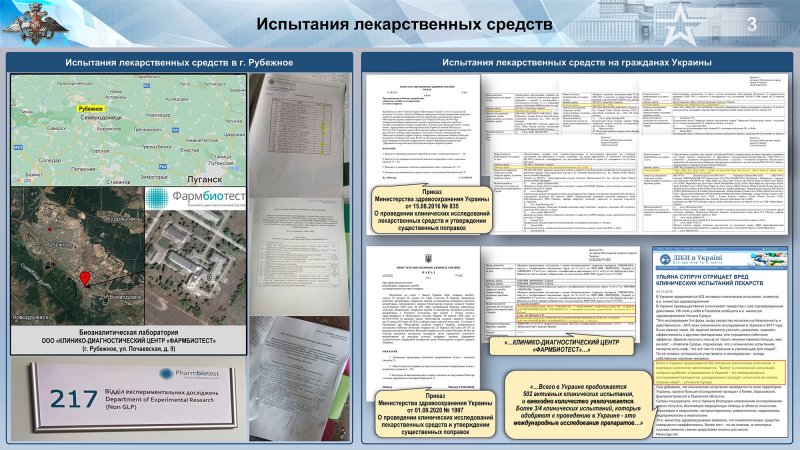 Во избежание репутационных рисков и судебных издержек, продолжил начальник российских войск РХБЗ, исследования новых фармпрепаратов американские и европейские компании проводили на украинских гражданах. «На Украине для этих целей использовались военнослужащие, малообеспеченные граждане, а также одна из наиболее незащищенных категорий граждан — пациенты психиатрических больниц. Оплата добровольцам при этом была минимальной, а летальные случаи можно было с легкостью скрыть», — рассказал генерал-лейтенант Игорь Кириллов, добавив, что серьезных проверок и надзора к работе этой компании со стороны местных властей не было.