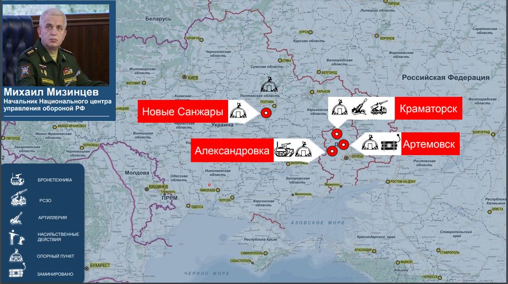 Также были уничтожены девять складов ракетно-артиллерийского вооружения в Донецкой Народной Республике, Харьковской, Запорожской и Николаевской областях. Кроме того, были поражены три склада топлива в районах городов Харьков, Богодухов и Чугуев Харьковской области.