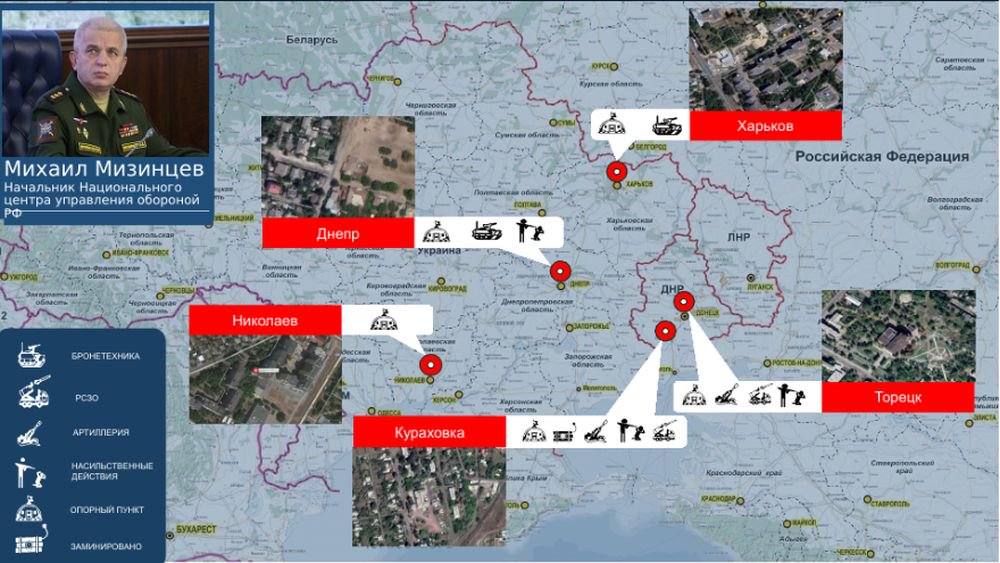Российский межведомственный координационный штаб по гуманитарному реагированию продолжает фиксировать факты преступных действий киевского режима в отношении мирного населения, а также использования украинскими вооруженными формированиями гражданских объектов в военных целях. О новых таких случаях рассказал руководитель этого центра, начальник Национального центра управления обороной РФ генерал-полковник Михаил Мизинцев.