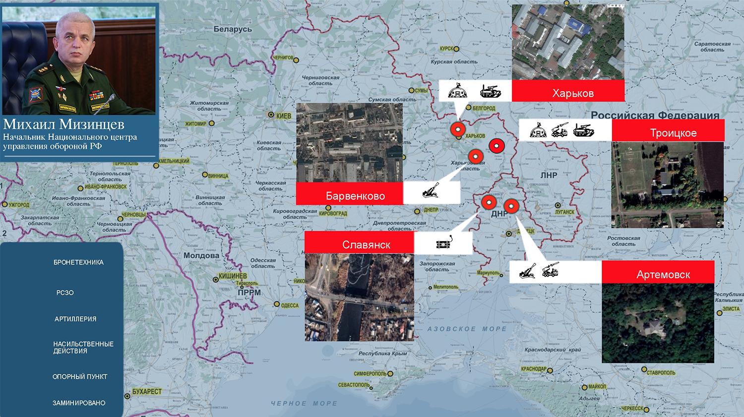 Конашенков доложил, что в ходе контрбатарейной борьбы около Раздоловки и Опытного были подавлены три украинских взвода РСЗО «Град». Четыре взвода гаубиц Д-30 накрыли огнем на позициях в районах Петровское, Красногоровка, Первомайское и Дзержинск в ДНР. А две американские гаубицы М777 — под Марганцом в Днепропетровской области.