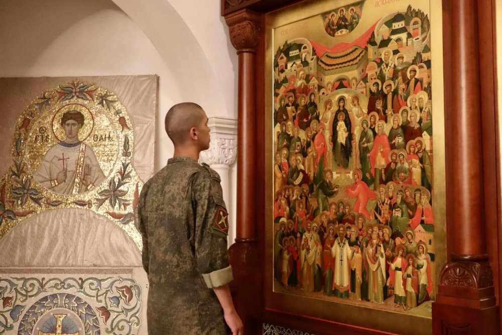 Отец Валерий: Конечно. Есть те, кто вместе со своим отрядом на три месяца уезжают на передовую — и вот там они как духовные отцы. Священник молится о здравии больных, отпевает тех, кого потеряли. Но работать мы начинаем уже здесь. Показываем наш храм, иконописную мастерскую, золотошвейную мастерскую и школу звонарей. Потом садимся, чаевничаем, беседуем о смысле бытия. Перед отправкой на первое боевое задание сначала говорят слова напутствия старшие товарищи, потом священник. Церковь призывает, чтобы бойцы были мужественны, чтобы чувствовали, что они — единое войско. И не забывали, что у Бога в руках и победа, и жизнь. Понимание этой связи с Богом укрепляет солдата для героических поступков.