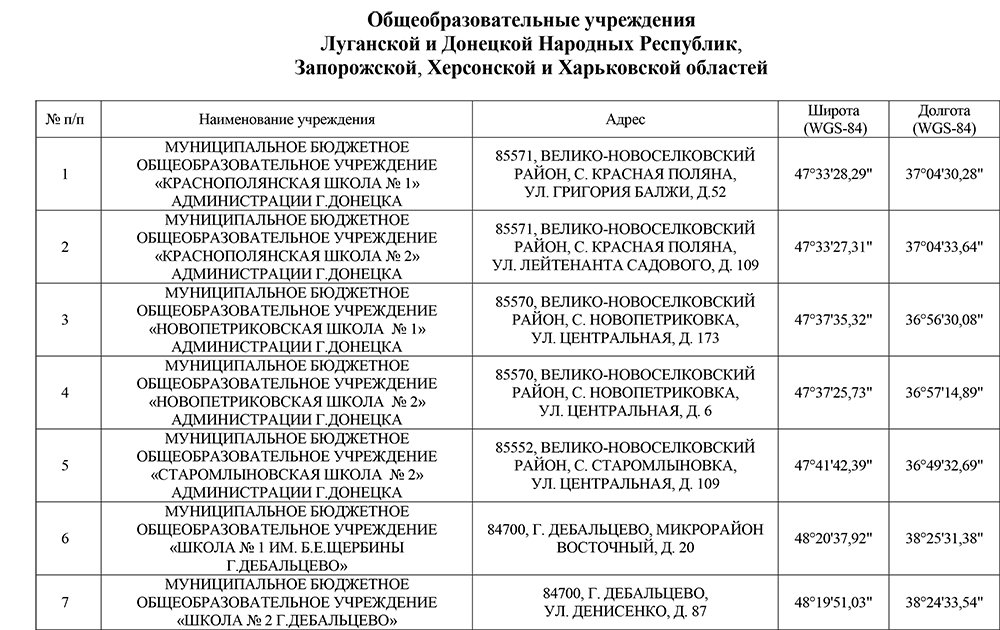 В ООН и Киеву для исключения обстрелов направлены адреса школ в Донбассе и на освобожденных территориях