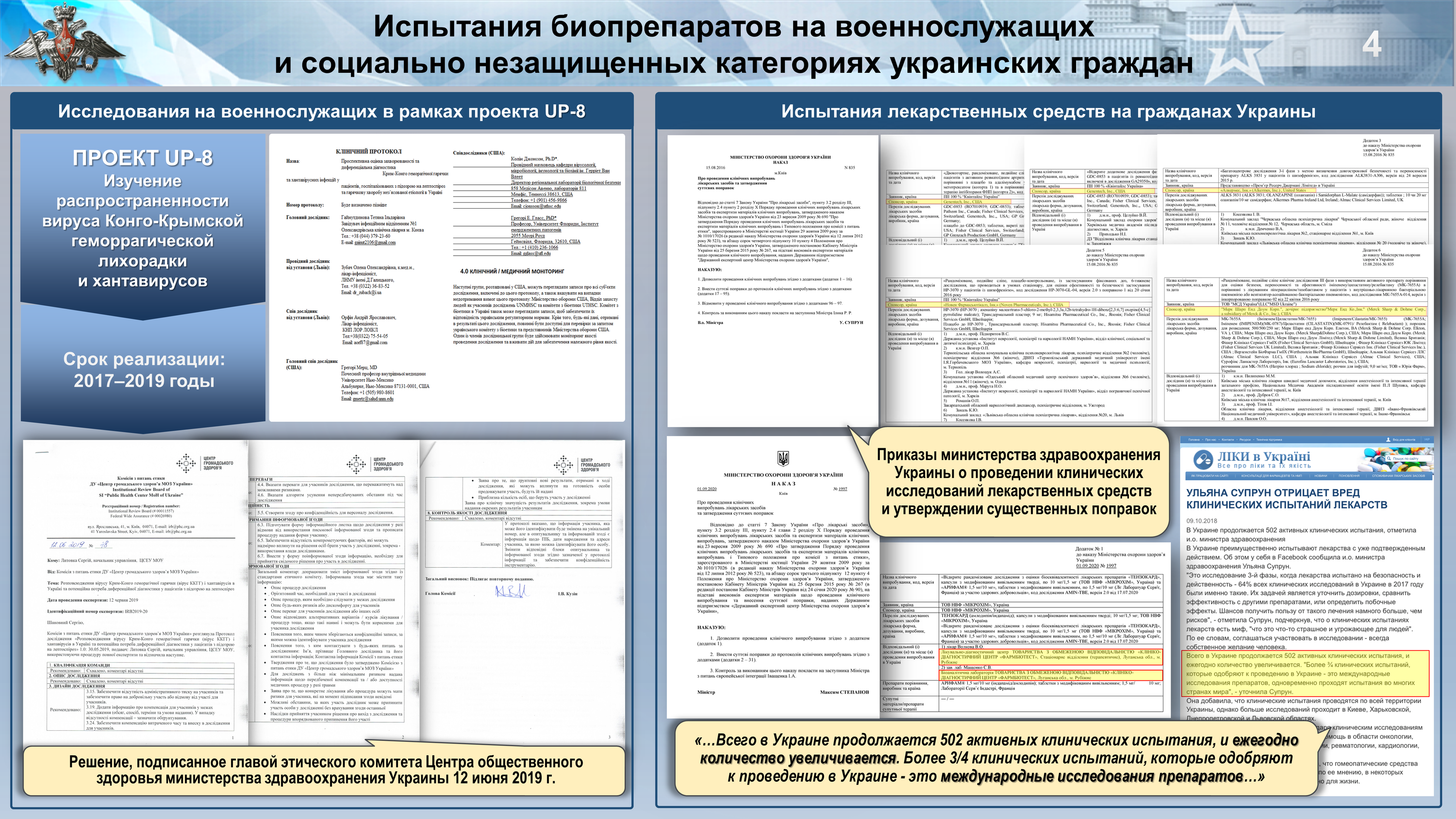 «При этом американских заказчиков интересует совсем другая номенклатура, а именно: холера, туляремия, чума, Конго-Крымская лихорадка, хантавирусы. Данные возбудители изучались в рамках так называемых украинских проектов «Ю-Пи» и «Тэп». Заинтересованность военных биологов США связана с тем, что эти патогены имеют природные очаги как на территории Украины, так и в России. А их применение может быть замаскировано под естественные вспышки заболеваний», — отметил генерал Кириллов.