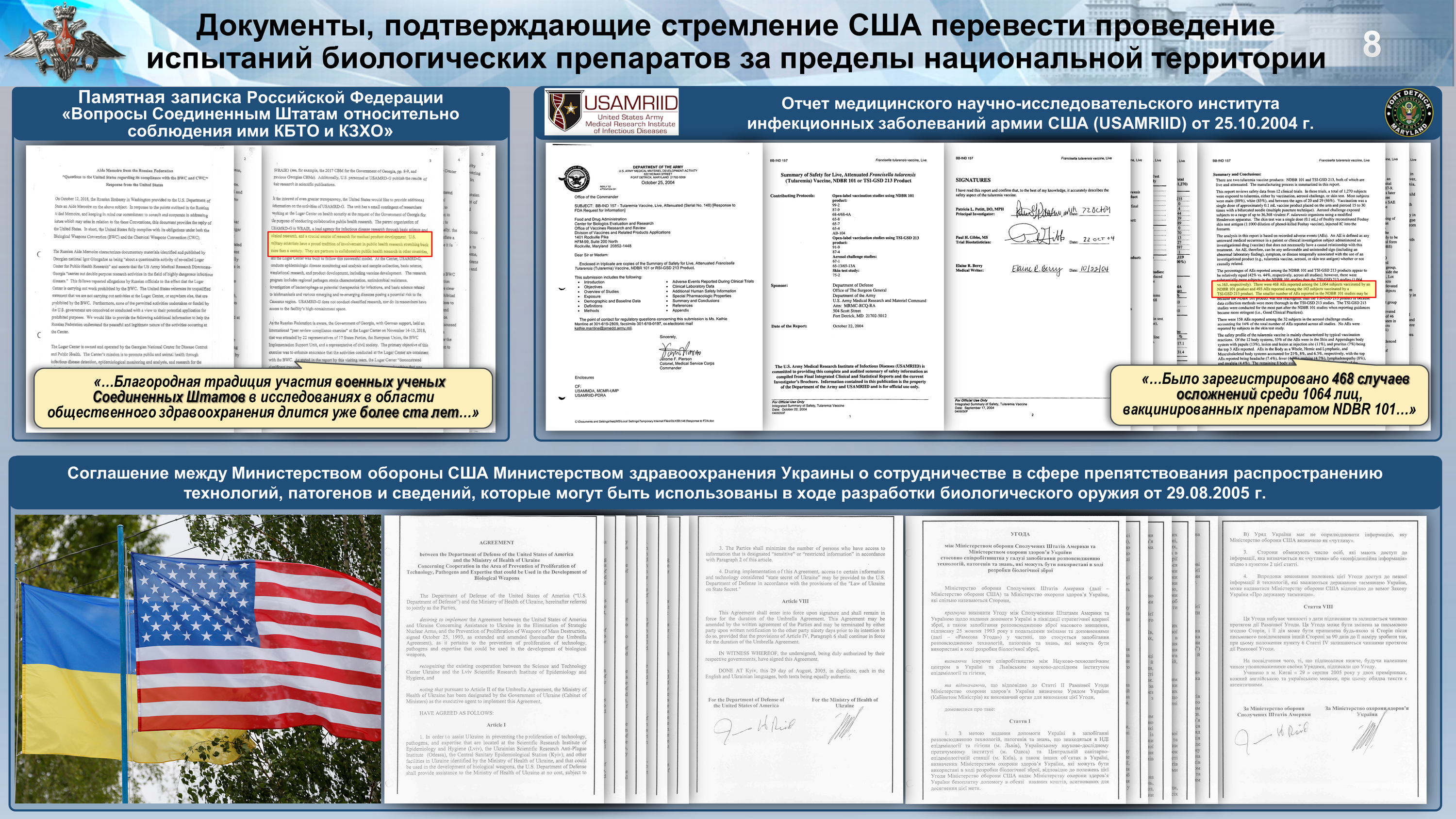 Отмечается, что деятельность биолабораторий и реализуемая Соединенными Штатами программа так называемого «реформирования» украинской системы здравоохранения привели к неуправляемому росту заболеваемости особо опасными и экономически значимыми инфекциями. «На территории Украины фиксируется рост числа случаев краснухи, дифтерии, туберкулеза. Заболеваемость корью увеличилась более, чем в 100 раз. Существенно ухудшилась ситуация по африканской чуме свиней. Суммарные потери сельскохозяйственной отрасли в государствах Восточной Европы от данного заболевания превысили 2,4 млрд евро», — говорится в материалах брифинга.