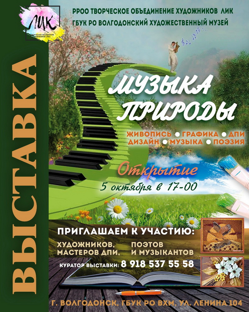 В городском художественном музее творческое объединение художников «ЛИК» открывает выставку » Музыка природы»в пятницу, 7 октября в 17 часов.