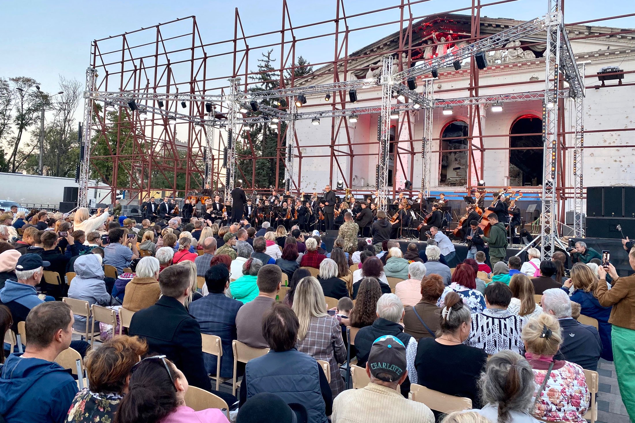 Между частями симфонии народный артист РСФСР Александр Михайлов читал замечательные стихи местных авторов. Стихотворение донецкого поэта Бориса Лукина о сыне Иване, геройски погибшем в бою в Мариуполе, заставило всех зрителей, что сидели на специально смонтированных стульях перед сценой, встать — и дальше уже все слушали симфонию стоя. На финале симфонии с ее знаменитым мотивом «Во поле береза стояла» на белых стенах театра, изрешеченных пулями, засветились березовые леса, и внутренности театра, залитые красными лучами прожекторов, засияли зеленым цветом борьбы и надежды. И на щеках зрителей-мариупольцев, не позволявших себе плакать все эти месяцы войны, заблестели слезы.