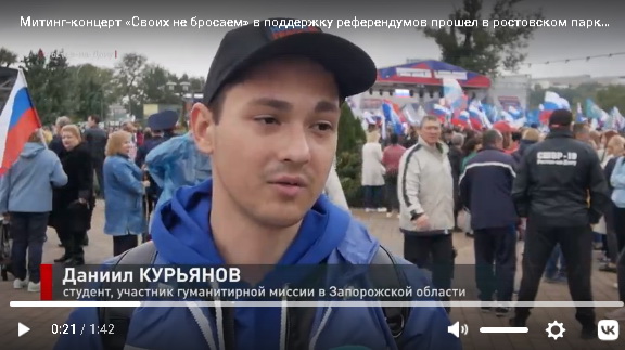 «Сегодня у нас проходит концерт в поддержку референдумов. Я был волонтером в самой первой поездке по доставке гуманитарной помощи жителям ДНР, ЛНР. Как человек, который был в Мариуполе, я там видел желание людей, который хотят присоединиться к нам».