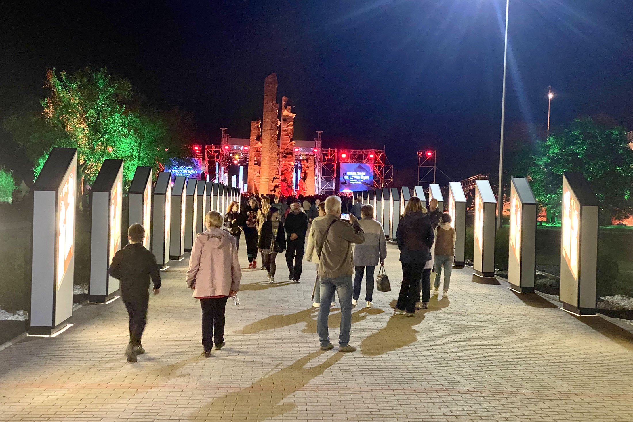 Залитые красным светом четыре чугунных пилона весом в 200 тонн символизируют шурф шахты, в который были сброшены замученные нечеловеческими пытками парни и девушки — 71 человек. Симфонический оркестр. Театральная постановка — рок-оратория «Молодая гвардия — черный январь 1943 года» луганских композитора Юрия Дерзкого и писателя Юрия Зайцева. Пронзительно и трогательно.