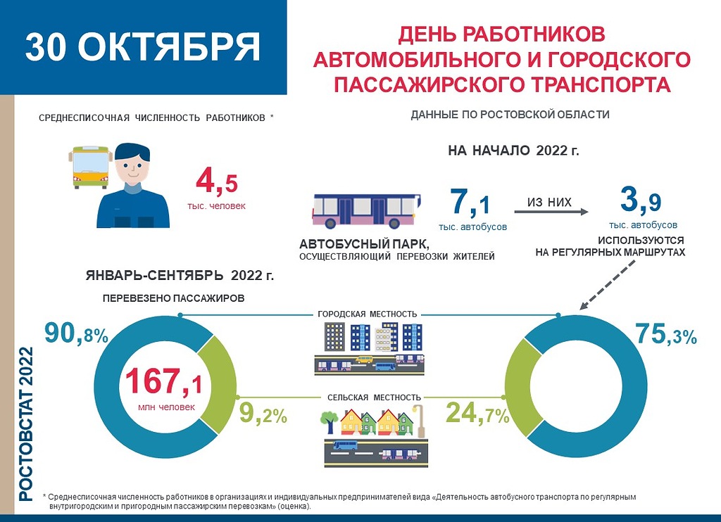 За 9 месяцев 2022 года автотранспортными компаниями и индивидуальными предпринимателями Ростовской области на регулярной основе было перевезено 167,1 млн человек, в том числе в городах 151,7 млн человек (90,8% от общего числа), в сельской местности – 15,4 млн человек (9,2%).