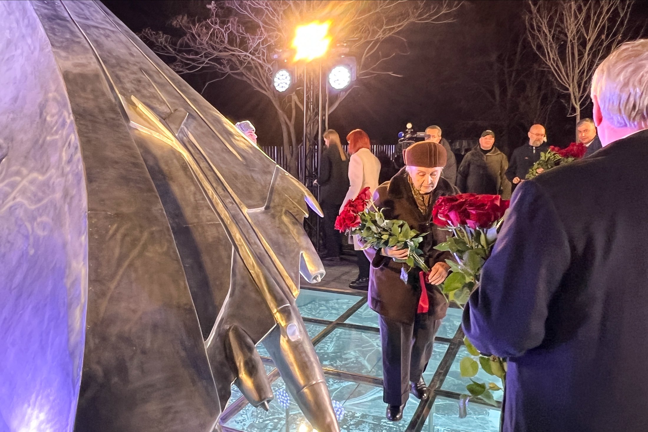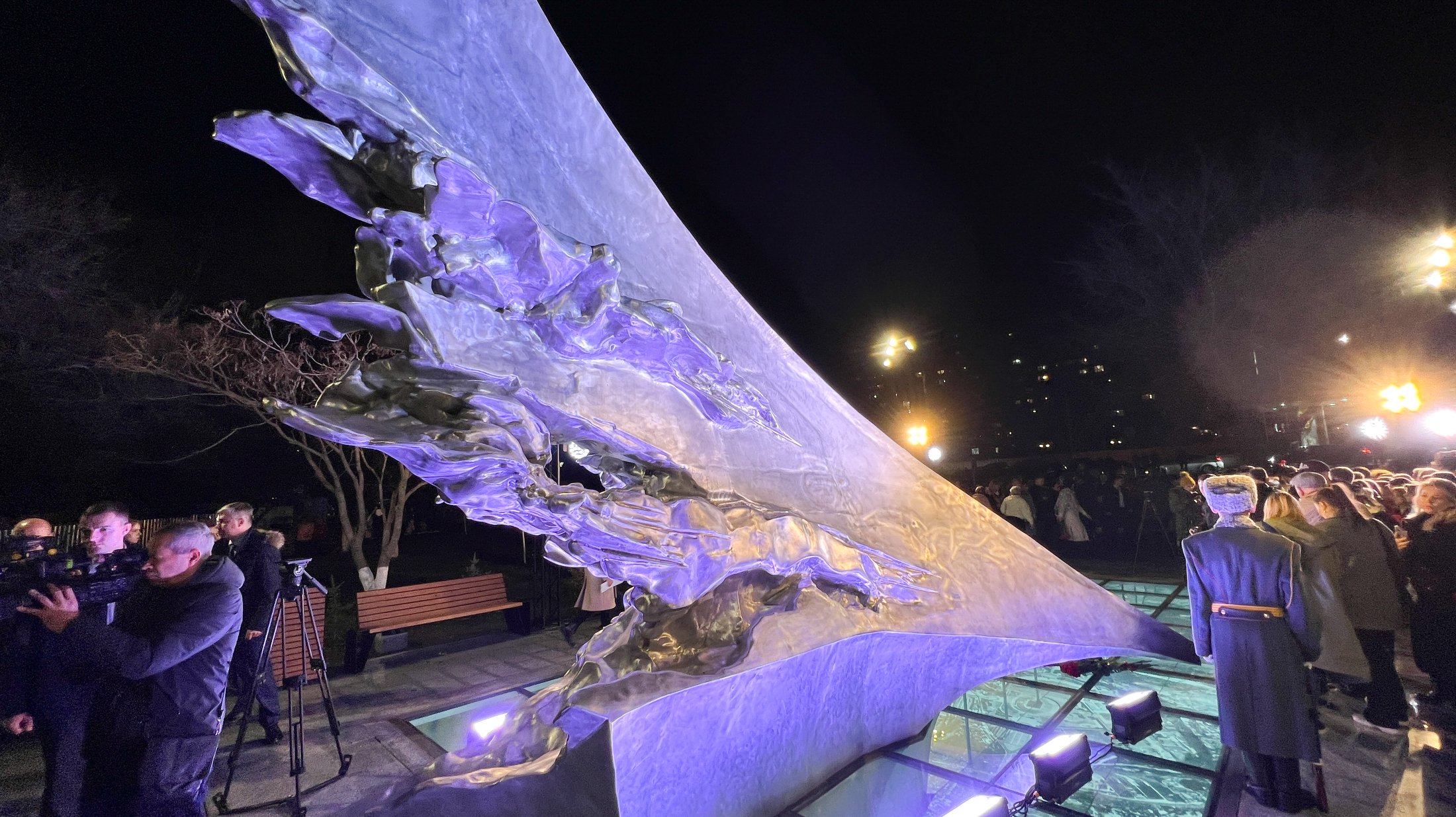 Скульптор поймал момент, когда истребитель, падая, меняет траекторию полета — прочь от города