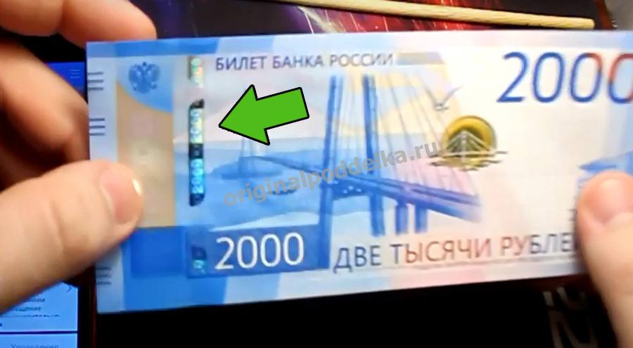 — Слева на лицевой стороне купюры, на однотонном поле с надписью «РОССИЯ» при изменении угла зрения становится видимым число «2000», каждая цифра которого окрашена в свой цвет. При повороте банкноты на 180 градусов без изменения угла зрения окраска цифр меняется.