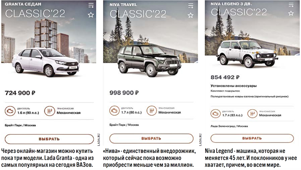 АвтоВАЗ запустил онлайн-витрину новых автомобилей, имеющихся в наличии у официальных дилеров на территории России. Купить через интернет можно пока только три модели Lada: «бюджетник» Granta, а также внедорожники Niva Legend и Niva Travel. Сервис позволяет пройти путь от выбора автомобиля до финальной сделки дистанционно. Несмотря на то что традиционная аудитория «Лады» в большинстве своем не приучена совершать крупные покупки через интернет, онлайн-магазин призван привлечь, в первую очередь, более молодых покупателей, которые в условиях сокращающегося выбора иномарок стали рассматривать и отечественную продукцию.