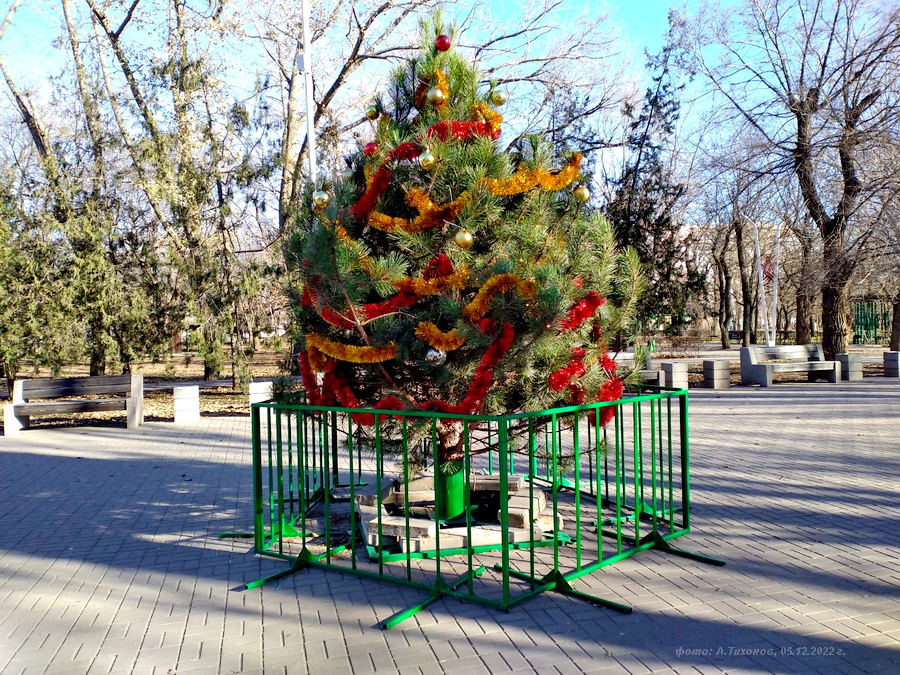 А рядом, на центральной аллее парка Победы уже установлена новогодняя ёлка и слегка украшена. Правда — это не ель, а сосна одним деревом.