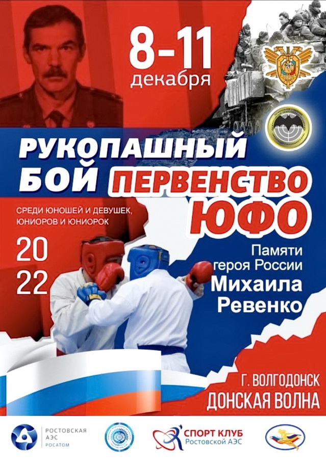 С 8 по 11 декабря в Волгодонске в центре загородного отдыха «Донская волна» (ул. Отдыха, 39б) пройдет первенство Южного федерального округа по рукопашному бою среди юношей и девушек 10-11, 12-13, 14-15, 16-17 лет, юниоров и юниорок 18-21 год.