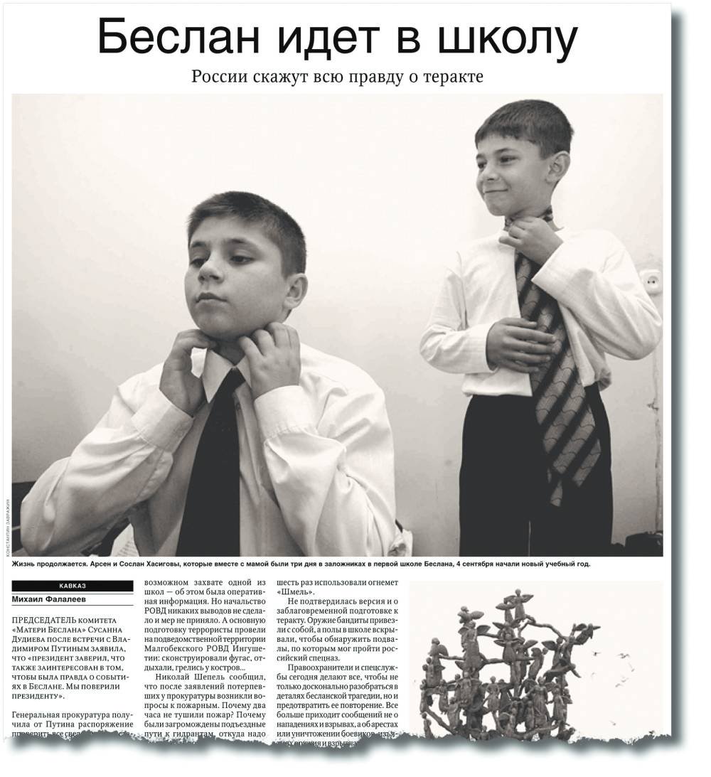 Вот уж, действительно, не дано предугадать, как слово наше отзовется… Фотокорреспондент «РГ» Константин Завражин неожиданно принес в редакцию вырезку из газеты с портретом двух подростков и информацию из северо-осетинской районки «Жизнь Правобережья». Рассказал, что в сентябре 2005-го, ровно через год после теракта в Беслане, он снимал братьев Сослана и Арсена Хасиговых, которые готовились идти в школу. И вот теперь он наткнулся на сообщение минобороны, в котором одного из братьев, Сослана, внесли в список награжденных медалью «За боевые отличия». «Может быть, однофамилец, но, скорее всего, это наш герой», — заметил наш фотокор.
