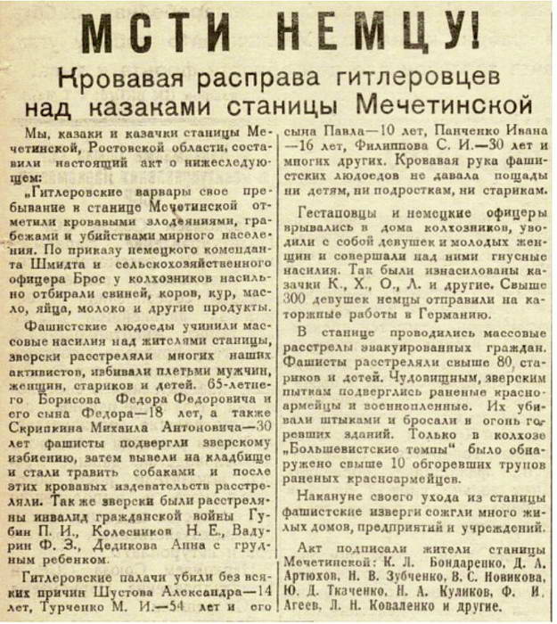 Знайте, люди, как это было. Этого нельзя забывать: «…на этой балке трупов было – не пройти. Хаты сгорели, одни трубы торчали. В хатах до самых подоконников солдаты мёртвые, обгоревшие, и вокруг всё телами усыпано. Страшно, неописуемо страшно. Нас, молодых девчат, старики на санях привезли из Мечётки собирать убитых, а мы все в кучу сбежались, в голос плачем, отойти боимся. Снег весь в крови, где рука, где нога, где полчеловека изуродованного, танком раздавленного. Накричались, а старшие просят: помогайте, девоньки, помогайте, родные. Надо. Силосная яма была, глубокая, длинная. В неё свозили обгорелых, закоченевших, изувеченных мёртвых солдат. Документы собирали. Где разбирали адрес, потом отсылали письма родным. Тяжко было видеть тела тех, с кем познакомились в Мечётке всего день – два тому назад. Плакали не переставая…»