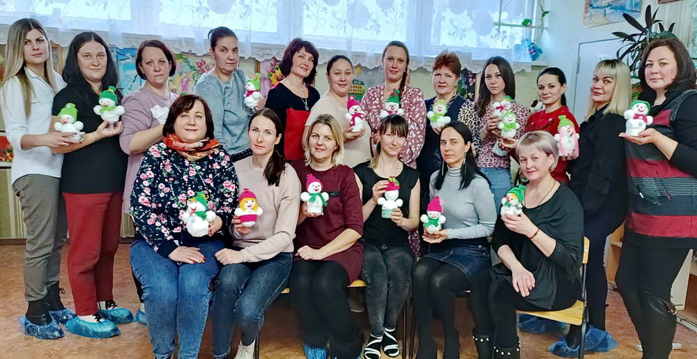 20 воспитателей освоили технику ватного папье-маше и изготовили веселых снеговиков.