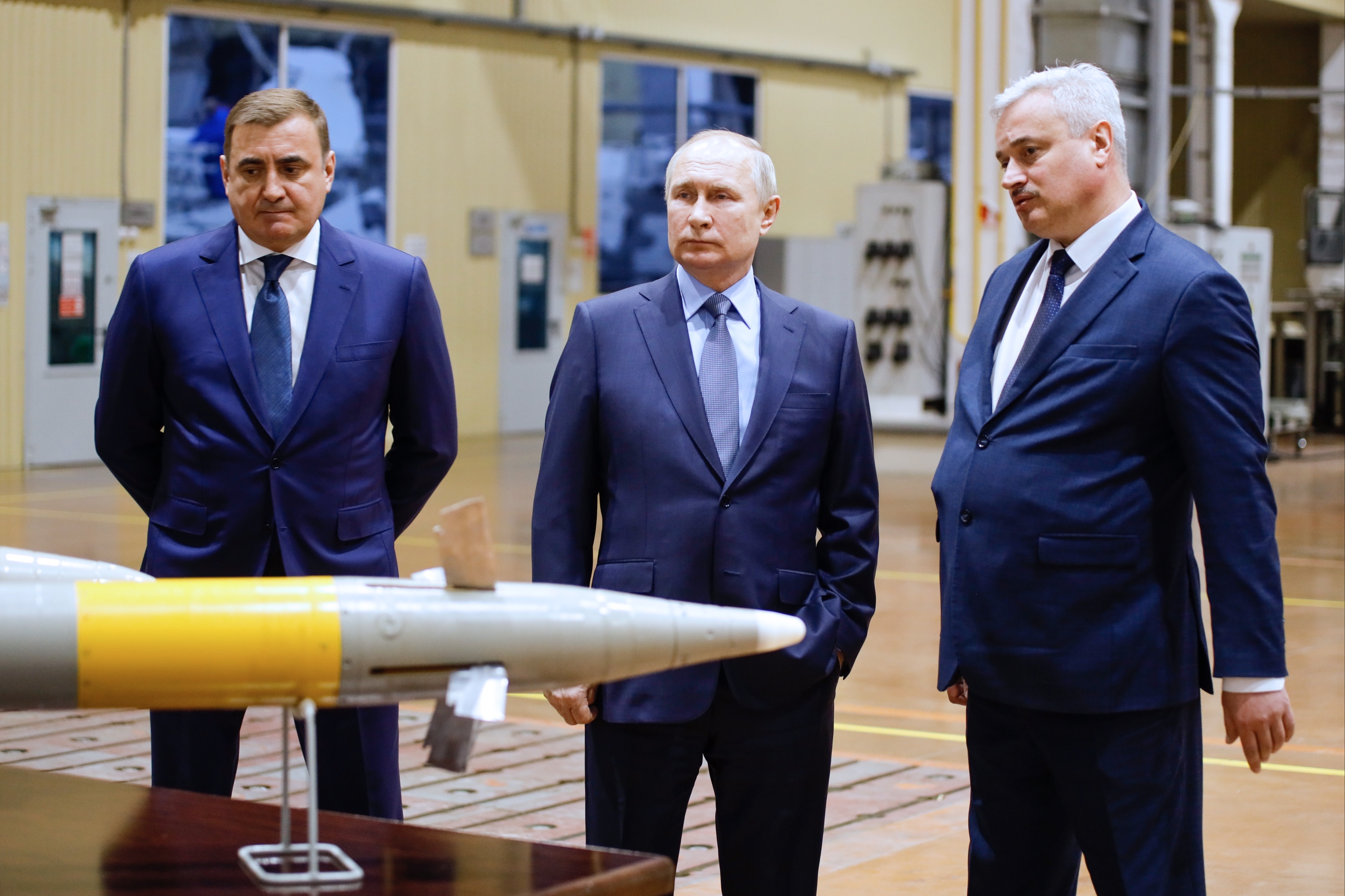 Владимир Путин, губернатор Тульской области Алексей Дюмин и генеральный директор «Щегловского вала» Алексей Вислогузов во время посещения машиностроительного завода «Щегловский вал».