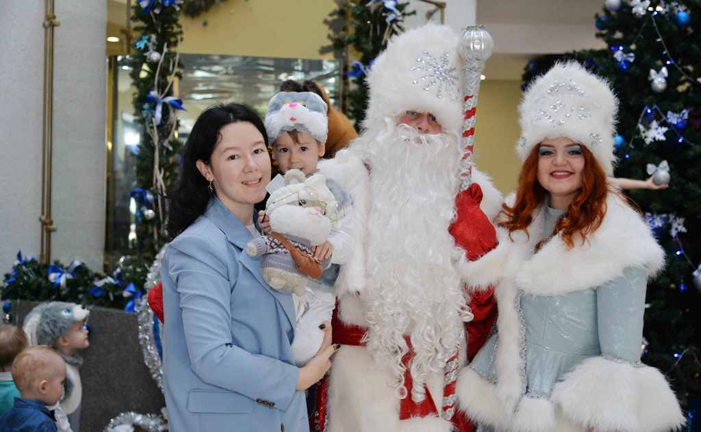 Подарки от «Елки желаний» детям вручали сразу несколько новогодних бригад Дедов Морозов и Снегурочек. В роли любимых новогодних персонажей — молодые атомщики.