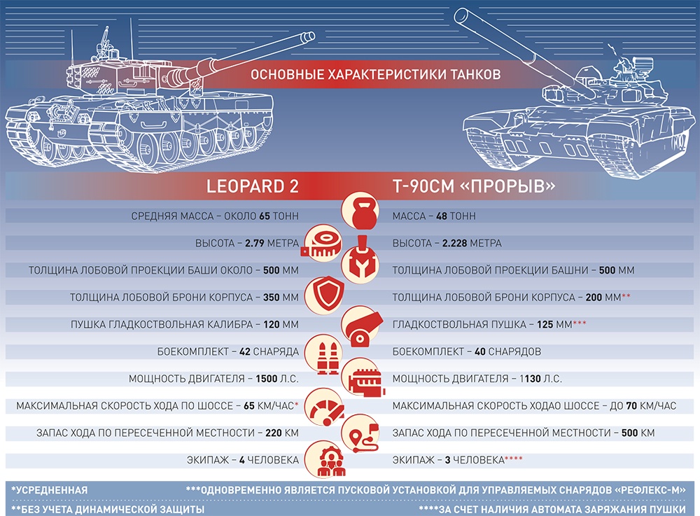 Как известно, основной танк бундесвера — это Leopard 2 различных модификаций. Внешне танк очень грозный. Масса его в современных версиях достигает 70 тонн. Для сравнения — масса Т-90СМ не более 48 тонн. Танк имеет очень качественную броневую защиту, особенно в лобовой проекции. Она состоит из кованых броневых листов и композиционных материалов. Его конструкторы даже заявляли, что их машина вообще непробиваема — оказалось, что это не так. Но в целом, стоит повторить, броня очень хорошая.