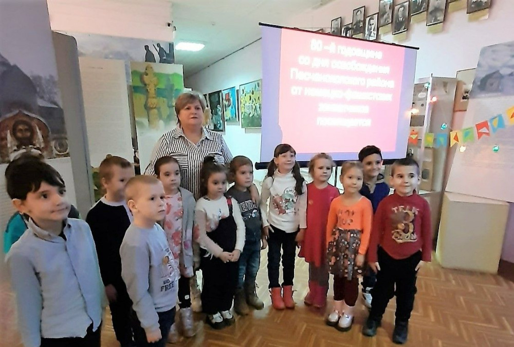 После экскурсии по выставке новогодних игрушек и знакомства с историей празднования Нового года в России, директор музея Шеневская А. И. провела для малышей музейный урок на тему «80 — летие освобождения Песчанокопского района от немецко-фашистских захватчиков».