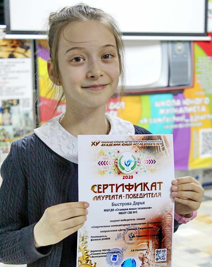 В число призеров секции вошли еще несколько учащихся СЮТ, которые осваивают современные компьютерные технологии под руководством педагогов Ирины Валентиновны Жуковой и Татьяны Ивановны Банниковой: 1 место было присуждено Екатерине Талалаевой (проект «Лошади»), 2 места у Екатерины Шеверевой (проект «Поехали»), Элины Омельченко (проект Roblox) и Александра Гридасова (проект «Волшебница Зима»), дипломы 3 степени получили Мирослава Манукян (проект «Василий Суриков – непревзойденный мастер исторических полотен»), Майа Толстых (проект «Лев Николаевич Толстой. Биография и творчество для детей»), Евгении Бондарева (проект «Кошки») и Ивана Вдовенко (проект «История появления компьютеров»).