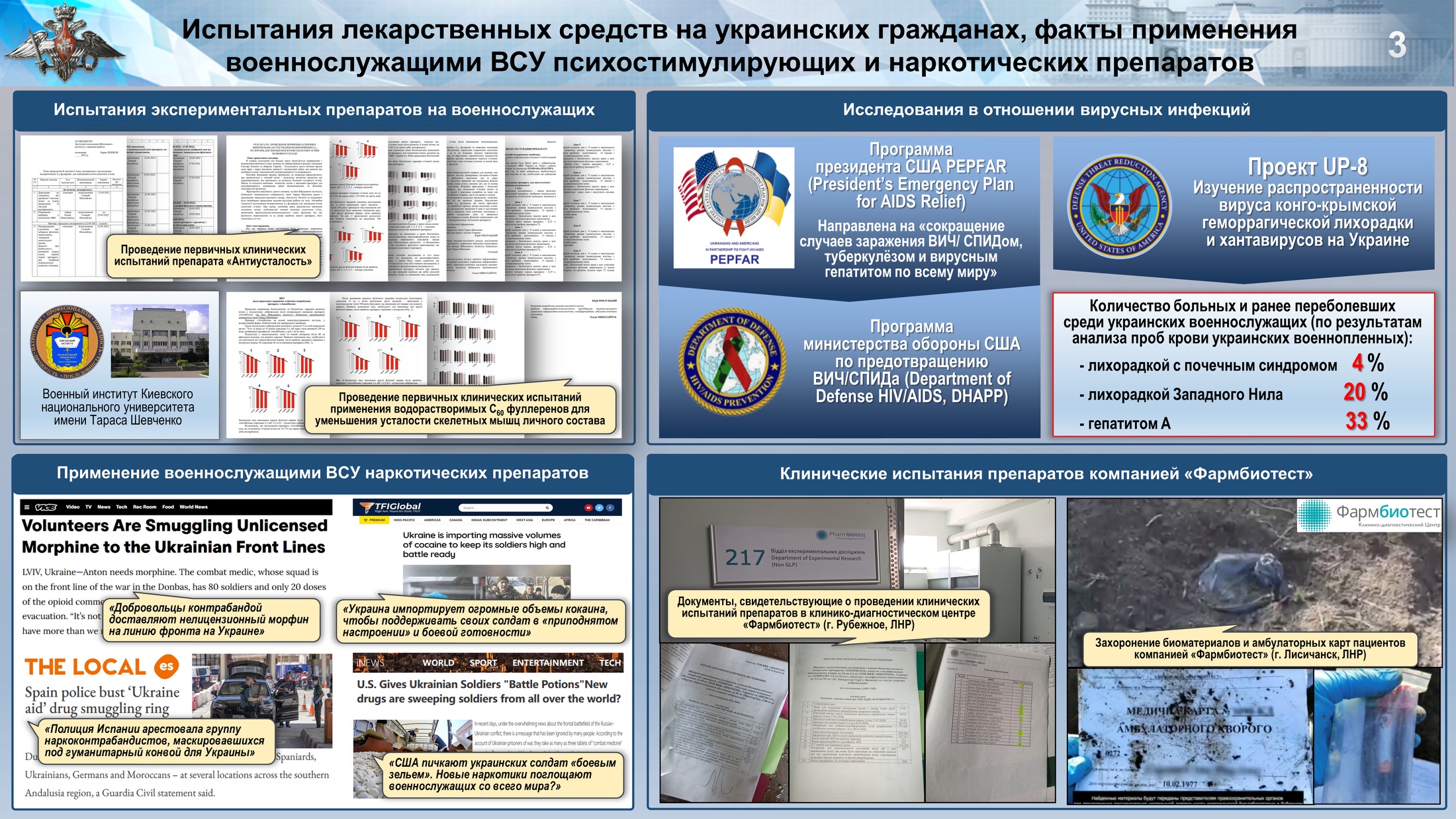 По словам генерала Кириллова, действия должностных лиц, проводивших исследования на украинских военнослужащих, в крови которых обнаружены высокие концентрации антибиотиков, наркотических препаратов, а также антитела к возбудителям инфекционных заболеваний, требуют соответствующей правовой оценки.