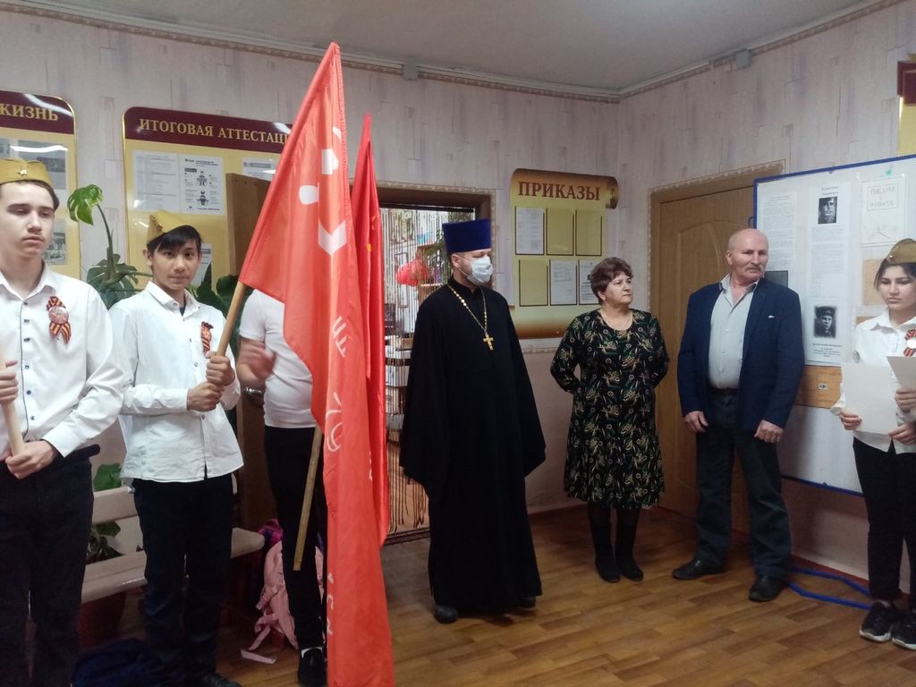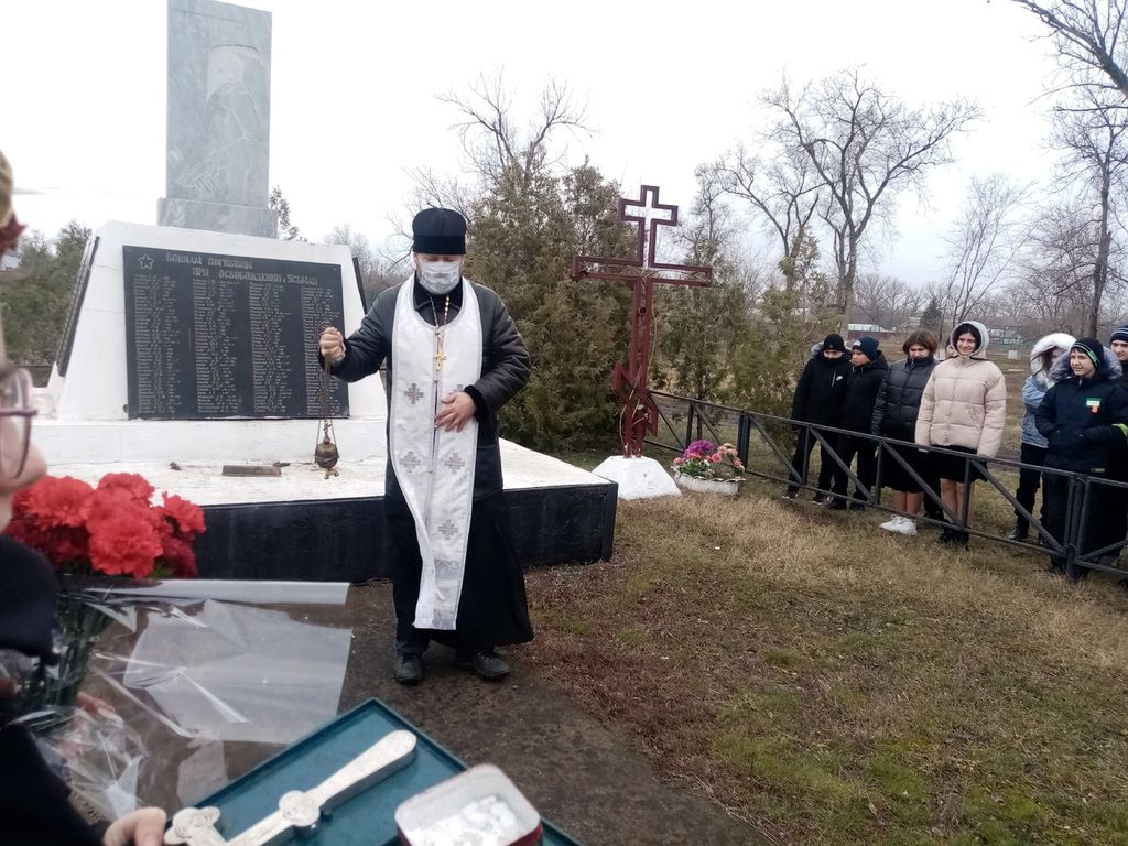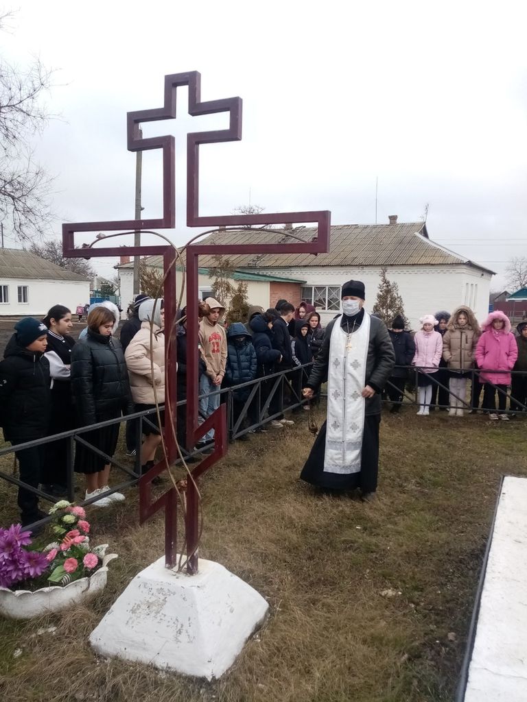 Учащиеся школы прочли стихи, и все присутствующие почтили память павших воинов минутой молчания. Затем у братской могилы во дворе школы протоиерей Роман отслужил заупокойную литию. После совместной молитвы были возложены цветы на могилу погибших воинов.