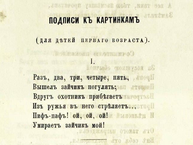 Неизвестен год первого издания трагедии про зайчика, но в шестом томе антологии автора, вышедшем за год до смерти поэта, в 1880 году, в разделе детских стихов, на последних страницах печатается серия «Подписи к картинкам. Для детей первого возраста».