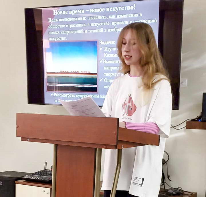 Лауреатом в секции «Искусство и молодежная субкультура» стала Жарова Мария, обучающаяся МБОУ СШ №18 г.Волгодонска, которая познакомила с творчеством К.Малевича и провела исследования на тему: «Новое время – новое искусство».