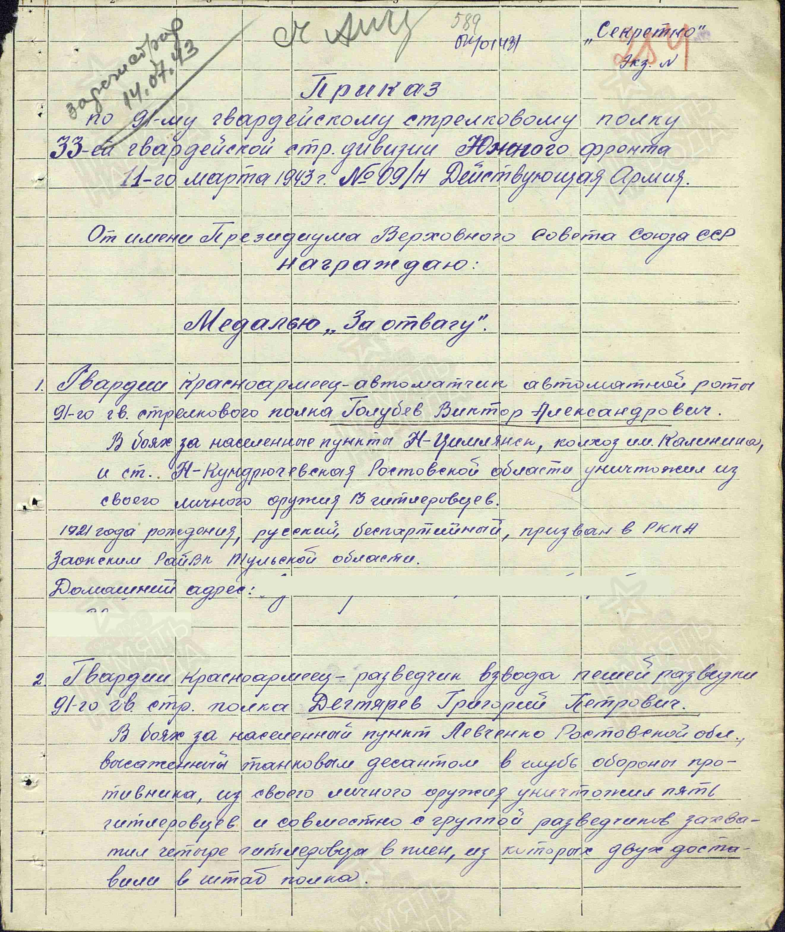 Его звали Голубев Виктор Александрович 1921 года рождения — совсем молодой человек. Он сражался в 91-м гвардейском стрелковом полку. Приказом по 91-му гвардейскому стрелковому полку 33-й гвардейской стрелковой дивизии Южного фронта от 11 марта 1943 года Голубев был награжден этой медалью. Другая важная информация, которую мы получили, касалась домашнего адреса этого военнослужащего. Он был жителем Тульской области Заокского района села Прокшино.