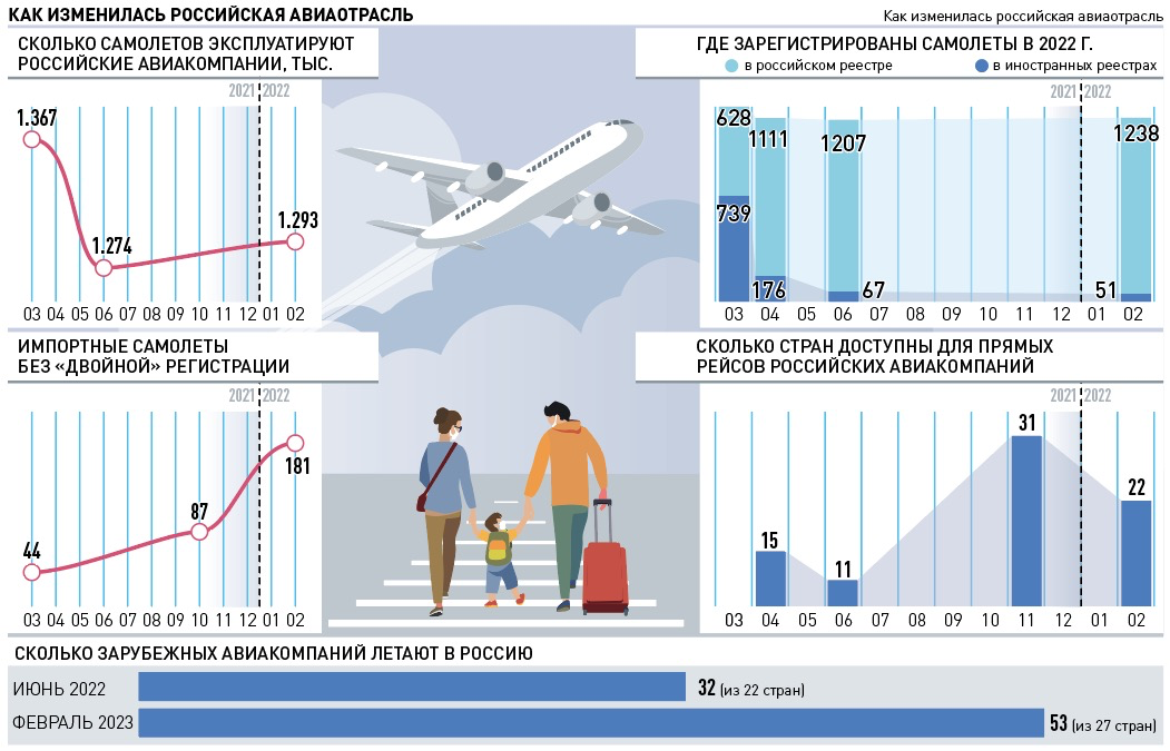 В отношении авиаотрасли был введен запрет на поставки самолетов, запчастей, предоставление страхования и обслуживания. Но самолеты зарубежного производства перевели в российский реестр и оставили у российских авиакомпаний. «Аэрофлот», S7 начали развивать собственные центры технического обслуживания самолетов. В феврале 2023 года ангар техобслуживания «Суперджетов» в аэропорту Жуковский открыла авиакомпания Red Wings. По выражению главы минтранса Виталия Савельева, «транспортная блокада» не помешала выполнить все поставленные задачи по развитию инфраструктуры и перевозке пассажиров, грузов. Хотя некоторые проблемы могут проявиться позже.