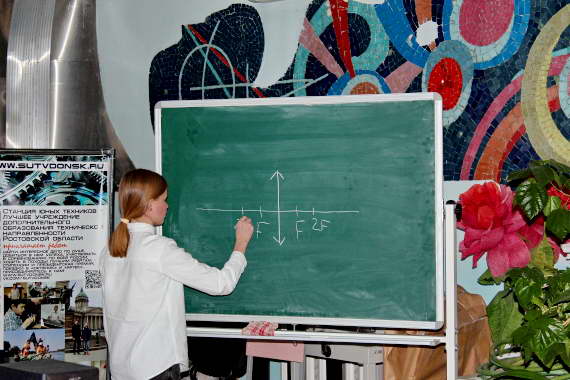 На первый взгляд скучное и не всем понятное название проекта, но если в школе вы не любили физику, потому что не понимали ее, то тогда вам к Алине. По крайней мере, в теме «Оптика» девятиклассница разбирается отлично, а еще лучше она объясняет, как говорится, буквально на пальцах. Вернее говорить объясняет неправильно, верно будет – продемонстрировала. Продемонстрировала свойства оптических линз, пояснив это схемой и формулами, нарисовав их мелом на доске. Все как в школе.