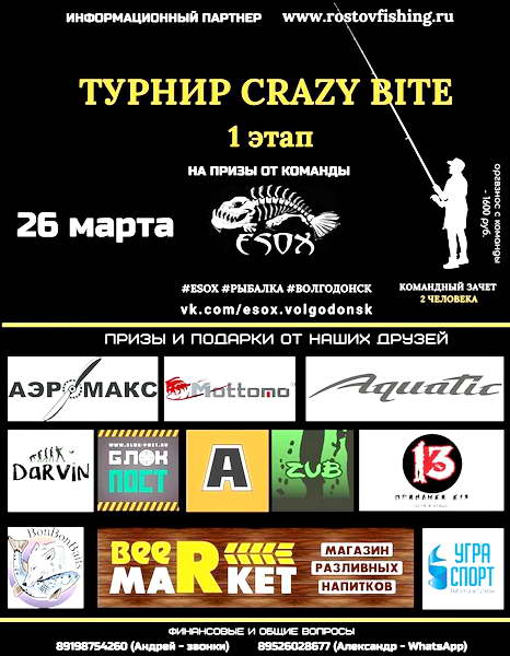 26 марта в Волгодонске состоится первый этап ежегодного турнира по ловле спиннингом с берега CRAZY BITE. В нем традиционно примут участие не только рыболовы-любители нашего города, но и спортсмены из других мест Ростовской области. Вот только в каком месте и на каком водоёме пройдут эти соревнования рыбаков пока не известно.