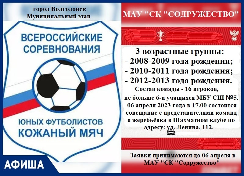 Традиционно в апреле и мае в России проходят муниципальные этапы ежегодного всероссийского турнира школьников по футболу «Кожаный мяч». Волгодонск не является исключением. Ежегодно в упорной борьбе определяются сильнейшие детские команды, которые делегируются их на областной этап. В этом году соревнования традиционно пройдут в трех возрастных группах: младшая (2012-2013 г.р.), средняя (2010-2011 г.р.) и старшая (2008-2009) г.р.