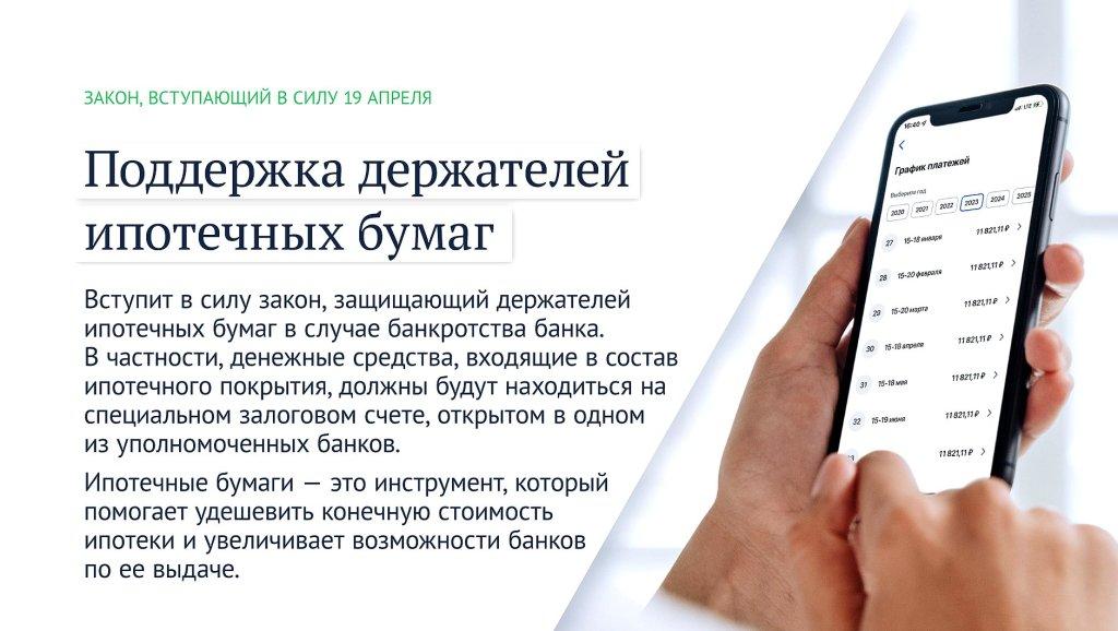 Вступит в силу закон, защищающий держателей ипотечных бумаг в случае банкротства банка. В частности, денежные средства, входящие в состав ипотечного покрытия, должны будут находиться на специальном залоговом счете, открытом в одном из уполномоченных банков.