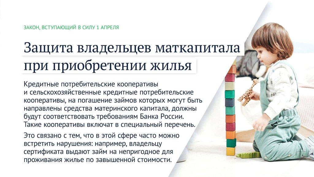 Кредитные потребительские кооперативы и сельскохозяйственные кредитные потребительские кооперативы, на погашение займов которых могут быть направлены средства материнского капитала, должны будут соответствовать требованиям Банка России. Такие кооперативы включат в специальный перечень.