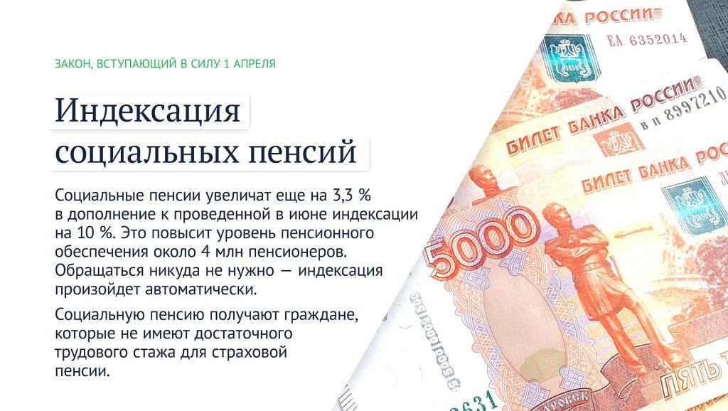 «Социальные пенсии повысят на 3,3 % в дополнение к проведенной в июне 2022 года индексации на 10 %. Таким образом, рост будет выше темпа инфляции. Изменения коснутся около 4 млн пенсионеров, которые получают пенсии по инвалидности, потере кормильца и др., — отметил Председатель ГД Вячеслав Володин.