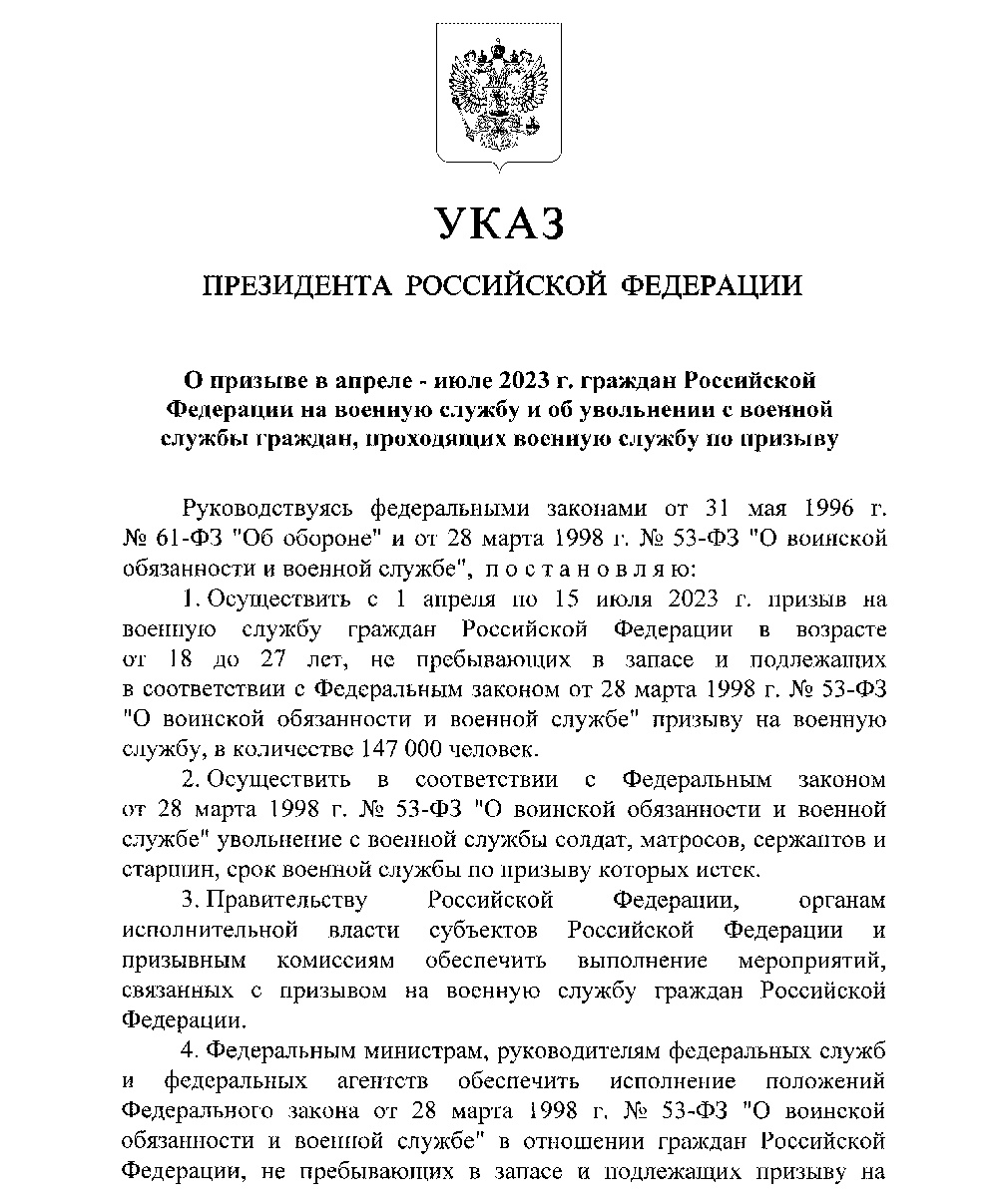 Президент России Владимир Путин дал старт весенней призывной кампании. Его указ № 220 называется «О призыве в апреле — июле 2023 г. граждан Российской Федерации на военную службу и увольнении с военной службы граждан, проходящих военную службу по призыву» — пишет наш информационный партнёр «Российская газета».