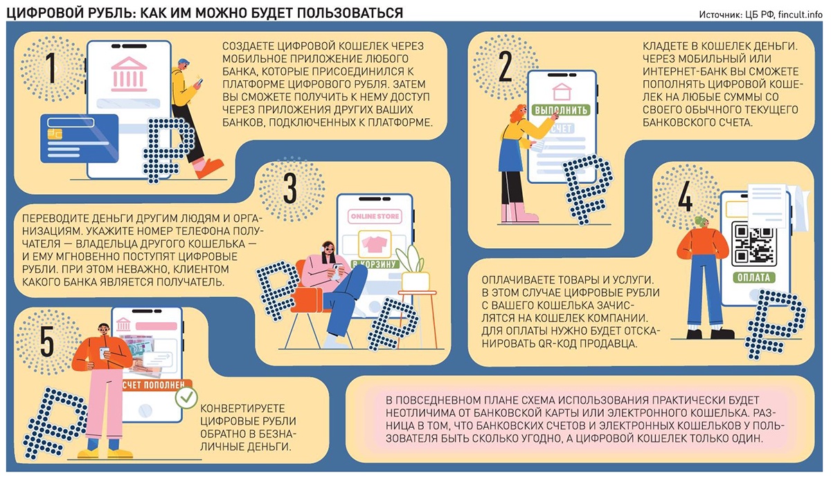 Цифровые рубли можно будет использовать точно так же, как и обычные купюры и монеты, банковские карты и электронные кошельки: расплачиваться за товары и услуги, делать переводы. Они будут эквивалентны наличным и безналичным: 1 наличный рубль = 1 безналичный рубль = 1 цифровой рубль.