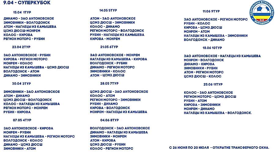 Источник: https://m.vk.com/lflvolgodonsk, https://volgodonsk.pro/news/35440-lyubitelskaja-futbolnaja-liga-volgodonska-8h8-otkryla-sezon-na-novom-stadione-czo-donskaja-vol.html